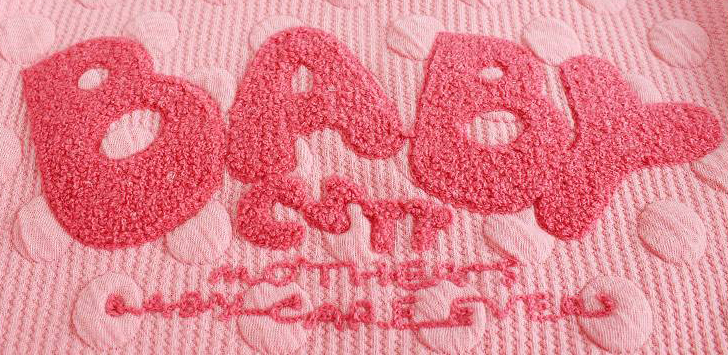 ? ? ? 屬于立體繡花,繡好效果很像毛巾布料,故名毛巾繡。主要運(yùn)用于外套、T恤、毛衣、褲裝等。
